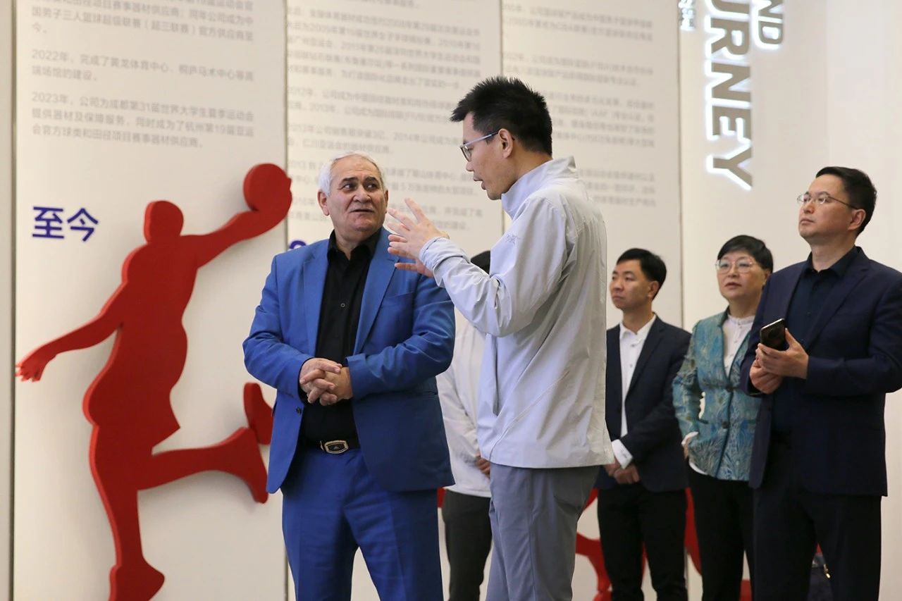 穆哈邁德·扎路主席一行在國家體育總局舉摔柔中心主任劉成亮、蘇州市體育局副局長程軍紅、張家港市文體廣旅局局長周穎和金陵體育總經(jīng)理李劍剛的陪同下,參觀了公司數(shù)字化展廳、產(chǎn)品展示館、智能化制造車間、檢測中心和金陵洲際文體,詳細(xì)了解了金陵體育的發(fā)展歷程、業(yè)務(wù)版圖以及智能化球館、籃球租售終端等數(shù)字化、網(wǎng)絡(luò)化、智能化技術(shù)下的創(chuàng)新模式和落地成果。