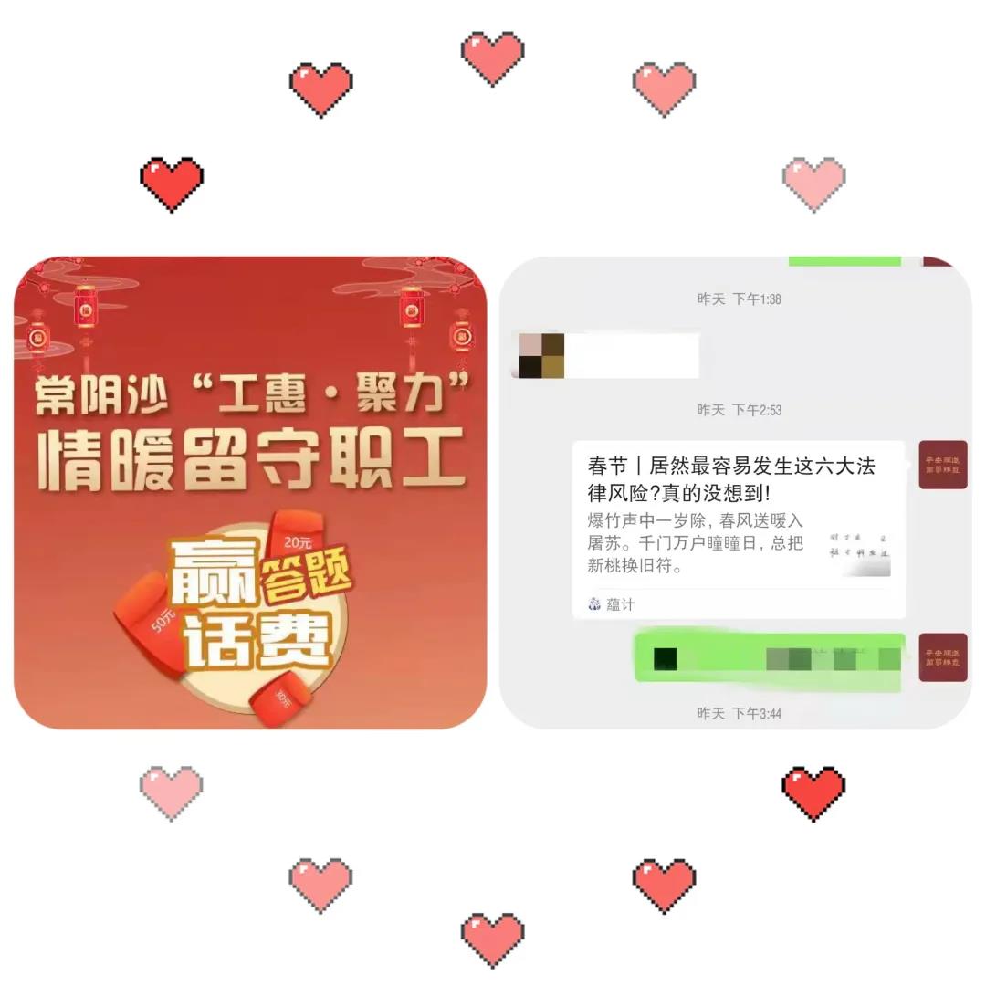 正月初一至初五常陰沙工聯(lián)會(huì)線上開(kāi)展新春答題贏話費(fèi)活動(dòng)。通過(guò)微信群等推送“以案釋法”案例等方式,為留守職工宣傳“喝酒不開(kāi)車(chē),開(kāi)車(chē)不喝酒”“喝酒需謹(jǐn)慎,勸酒須擔(dān)責(zé)”等春節(jié)期間常見(jiàn)問(wèn)題,同時(shí)也宣傳了疫情防控信息和知識(shí)。
